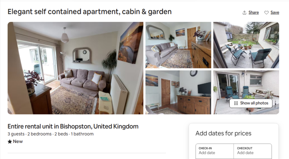 - Self contained apartment + cabin: £120 to £175 / night (max 3 people)